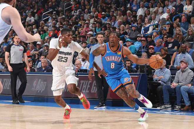 次节比赛,雷霆连续两节单节得分30+,且第二节完成首次单节得分35+,还限制灰熊连续两节不足30分。第二节前3分钟雷霆40-39领先,雷霆一波7-0攻势拉开比分,灰熊冲击内线追到差5分。亚历山大与杰伦引领一波12-0攻势,雷霆扩大64-47领先17分优势,灰熊打出一波7-3攻势追分,雷霆单节36-26净胜10分,上半场结束雷霆扩大67-54领先灰熊。前两节比赛,灰熊三分20中10,全队没有球员得分上双,雷霆三分20中9,亚历山大17+3+5与杰伦12分。