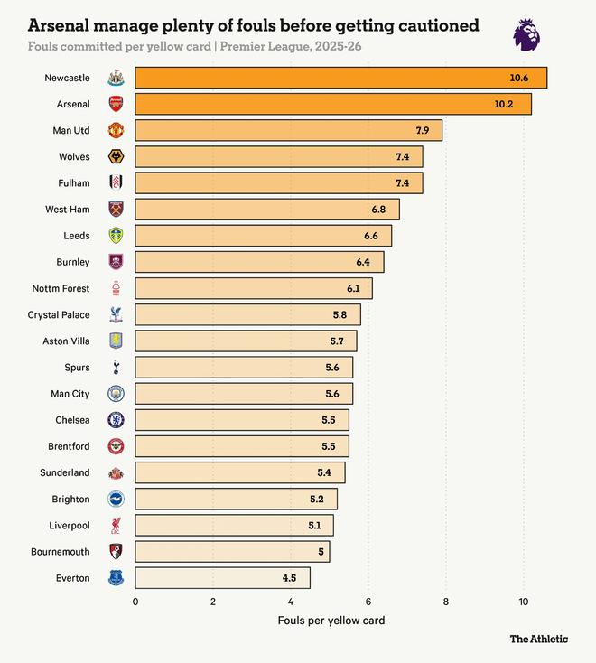 阿森纳目前平均每10.2次犯规才吃到一张黄牌——只有纽卡斯尔联(10.6)在未受警告的情况下犯规次数更多。在英超最近一轮1-0战胜伯恩利的比赛中,加布里埃尔是唯一吃到黄牌的阿森纳球员。他的犯规原因?一次在本方禁区边缘试图夺回球权时过于激进的上抢。