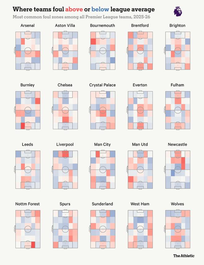 The Athletic 已将本赛季20家俱乐部的犯规地点绘制成图,并与英超其他球队进行了比较。